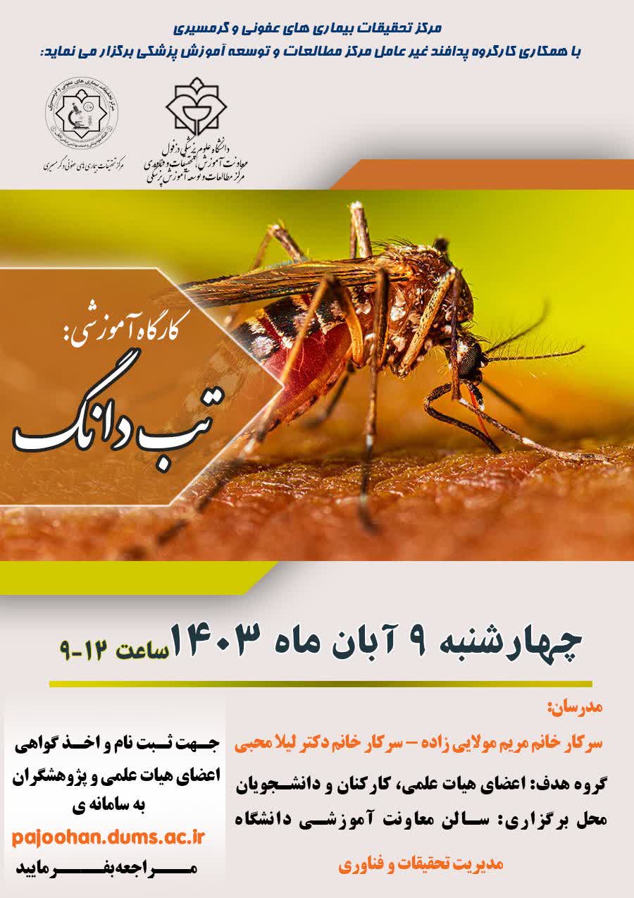 کارگاه آموزشی تب دانگ به همت مرکز تحقیقات بیماری های عفونی و گرمسیری دانشگاه علوم پزشکی دزفول در روز چهارشنبه مورخ 9 آبان 1403 با حضور بیش از 30 نفر از کارکنان و اعضای محترم هیات علمی در محل سالن معاونت آموزش، تحقیقات و فناوری دانشگاه علوم پزشکی دزفول برگزار گردید.